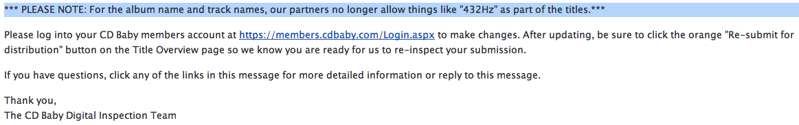 The term “432 Hz” is officially censored by some big players in the music industry. I know it’s shocking, but on July 21, 2018 I was notified by CDBaby (a music distributor) via email that my latest EP will not be delivered to their “partners” i.e. iTunes, Google, Amazon, Spotify, etc. because their partners no longer allow 432 Hz to appear anywhere on the album! So now apparently album titles and song names may not contain 432 Hz.